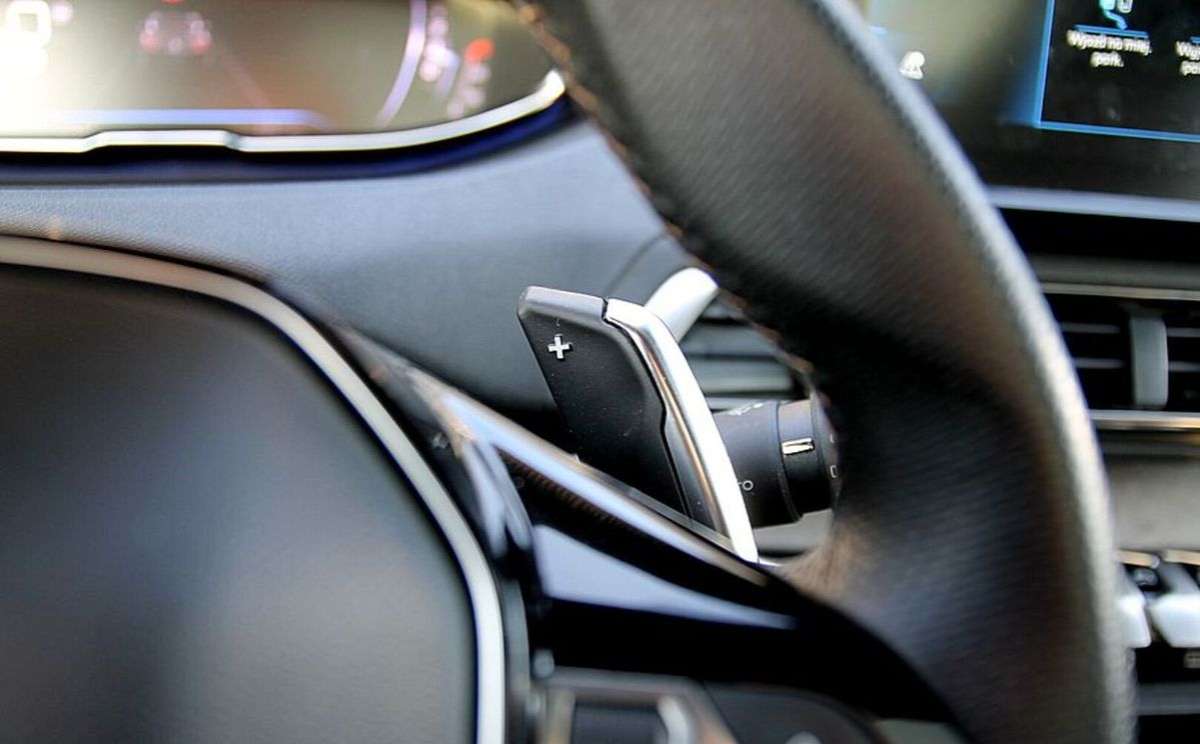 Kierownica pokryta skórą licową, z metalowymi wstawkami oraz logiem GT
